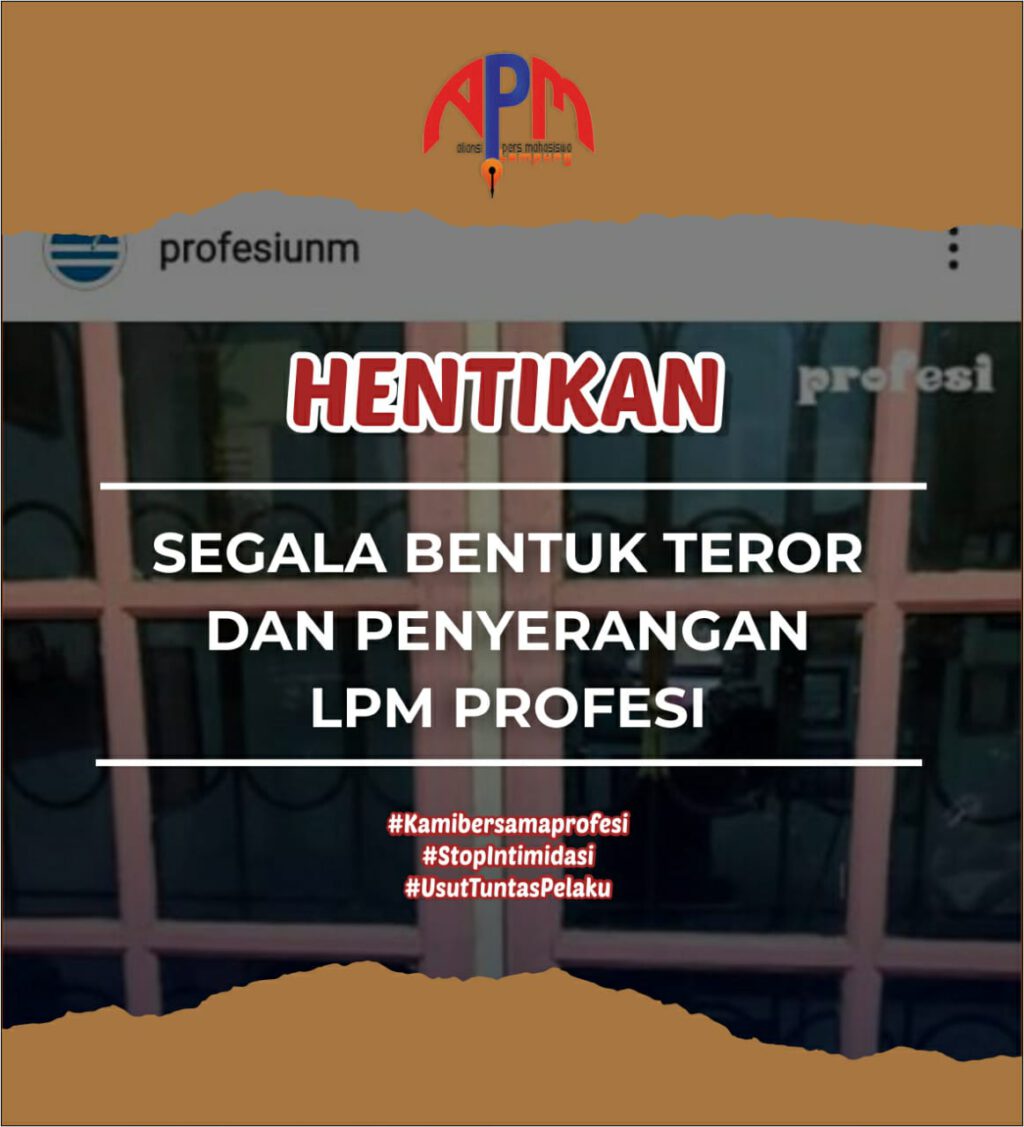 Apml Kecam Penyerangan Terhadap Lpm Profesi Unm. Atas intimidasi dan kekerasan terhadap jurnalis tersebut, AJI Makassar mengecam keras tindakan intimidasi dan kekerasan yang dilakukan oleh Rektor UNM Husain Syam terhadap jurnalis atau reporter LPM Profesi UNM Makassar karena pemberitaan. LPM Profesi UNM membuka dan menyalurkan donasi anda kepada masyarakat yang mengalami korban bencana alam Sulawesi Barat.