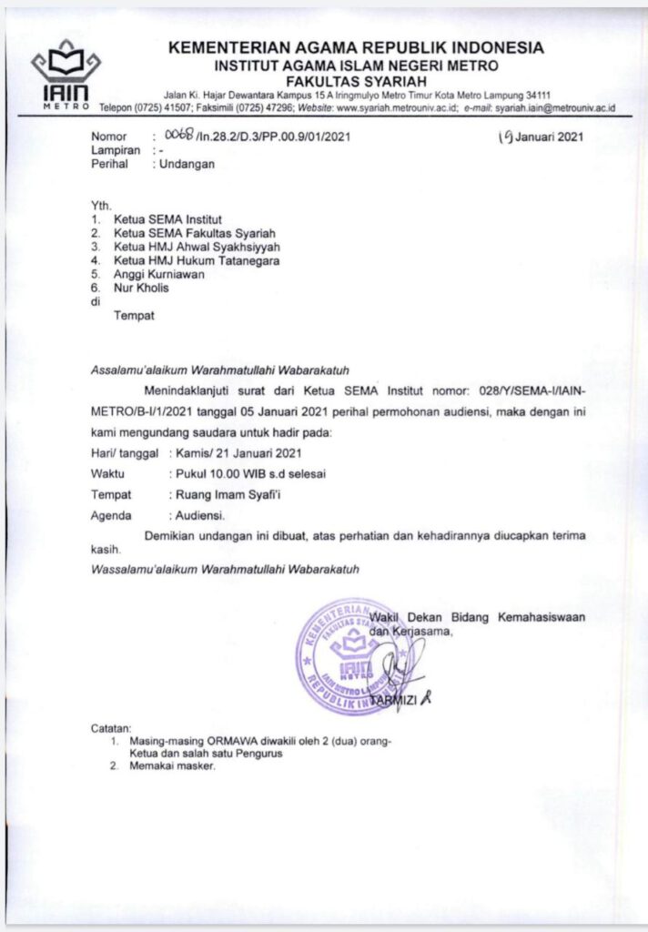 Kemudian, harapan ketua umum UKMI Nurul Ilmi terkait adanya acara ini adalah agar mahasiswa lebih mengenal kampus IAIN. Perkuliahan daring IAIN Metro sudah berlangsung dua minggu lebih, kampus memilih untuk menggunakan platform Moodle yang berbasis Learning Management System (LMS). Metro (Pendis) - Bulan Desember adalah bulan suksesi kepemimpinan bagi sejumlah Organisasi Kemahasiswaan (ORMAWA) Intra Kampus di lingkungan Perguruan Tinggi Keagamaan Islam Negeri (PTKIN), diantaranya IAIN Metro Lampung.