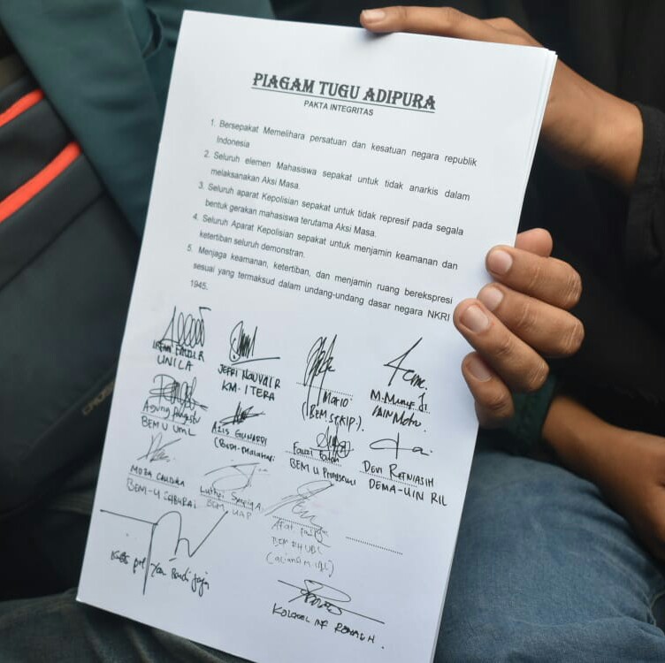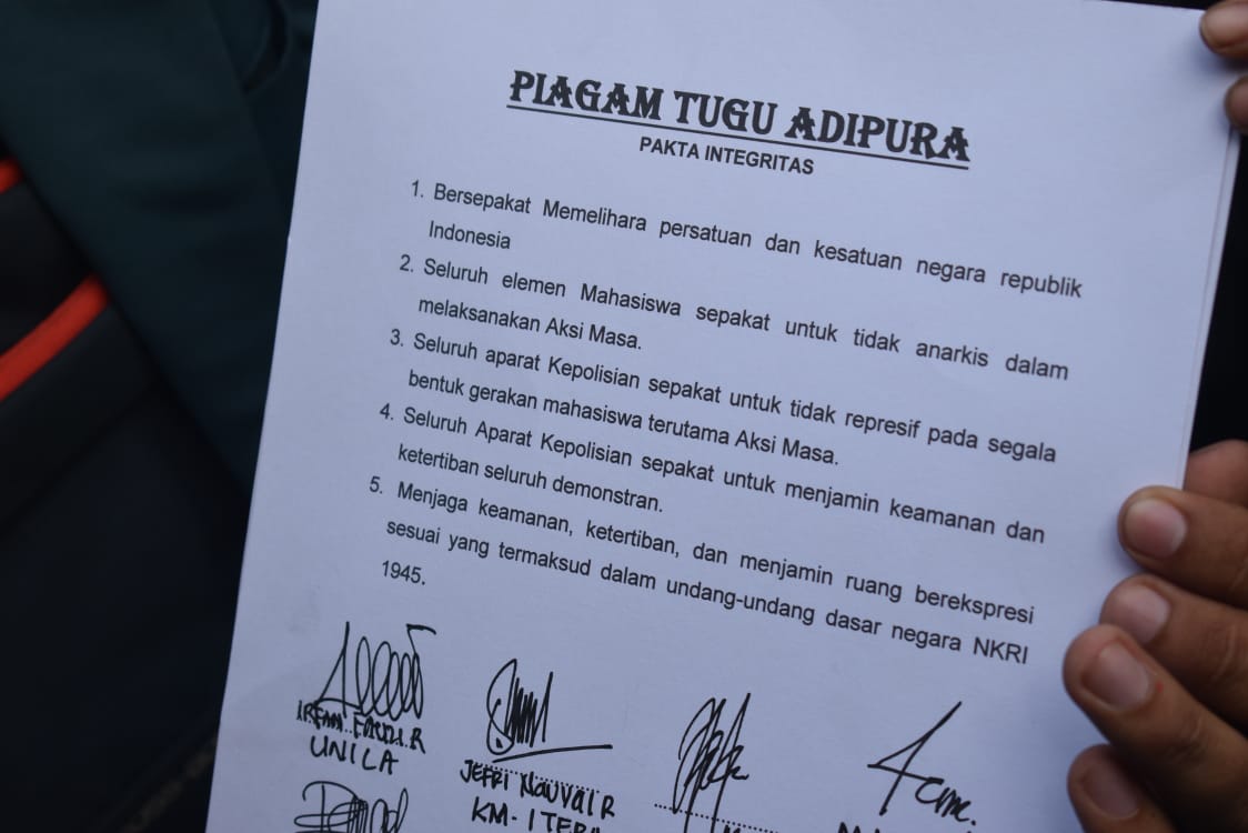 Penandatanganan Piagam Adipura Wujud Damai Mahasiswa Dengan Aparat. Seluruh aparat kepolisian sepakat untuk menjamin keamanan dan ketertiban demonstrasi. Piagam Jakarta menjadi dasar sidang BPUPKI I C.